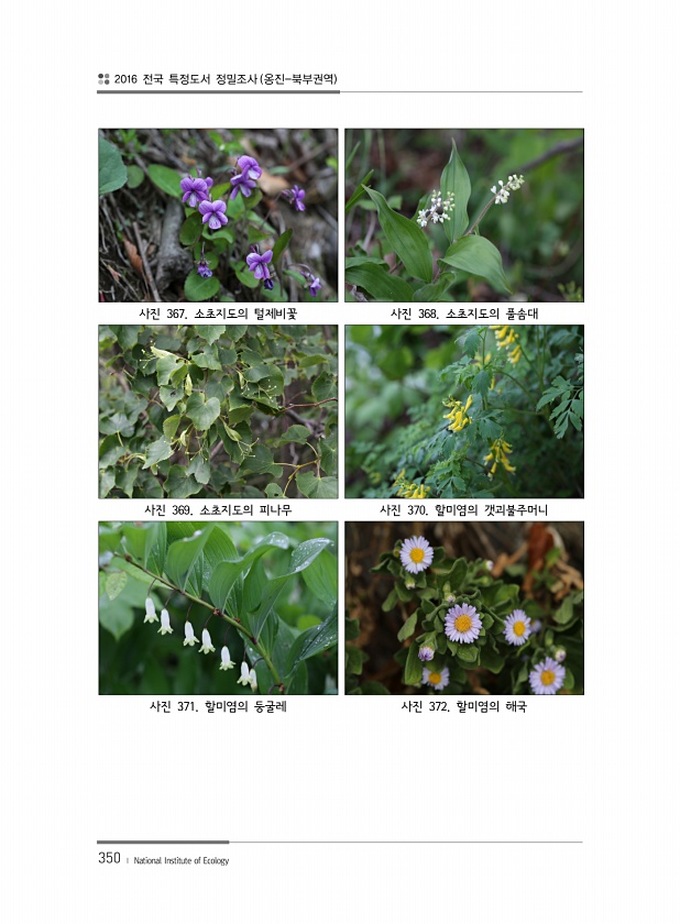 2016 전국 특정도서 정밀조사 옹진-북부권역 350 ? National Institute of Ecology 사진 367. 소초지도의 털제비꽃 사진 368. 소초지도의 풀솜대 사진 369. 소초지도의 피나무 사진 370. 할미염의 갯괴불주머니 사진 371. 할미염의 둥굴레 사진 372. 할미염의해국