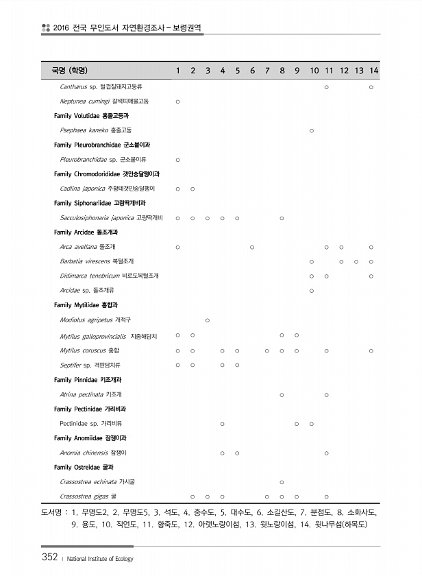 2016 전국 무인도서 자연환경조사 보령권역 352 ? National Institute of Ecology 국명 학명 1 2 3 4 5 6 7 8 9 10 11 12 13 14 Cantharus sp. 털껍질돼지고둥류 ○ ○ Neptunea cumingi 갈색띠매물고둥 ○ Family Volutidae 홍줄고둥과 Psephaea kaneko 홍줄고둥 ○ Family Pleurobranchidae 군소붙이과 Pleurobranchidae sp. 군소붙이류 ○ Family Chromodorididae 갯민숭달팽이과 Cadlina japonica 주황테갯민숭달팽이 ○ ○ Family Siphonariidae 고랑딱개비과 Sacculosiphonaria japonica 고랑딱개비 ○ ○ ○ ○ ○ ○ Family...