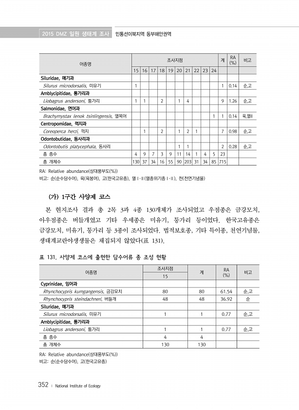 2015 DMZ 일원 생태계 조사 민통선이북지역 동부해안권역 352 ? National Institute of Ecology 어종명 조사지점 계 RA % 비고 15 16 17 18 19 20 21 22 23 24 Siluridae, 메기과 Silurus microdorsalis, 미유기 1 1 0.14 순,고 Amblycipitidae, 퉁가리과 Liobagrus andersoni, 퉁가리 1 1 2 1 4 9 1.26 순,고 Salmonidae, 연어과 Brachymystax lenok tsinlingensis, 열목어 1 1 0.14 육,멸II Centropomidae, 꺽지과 Coreoperca herzi, 꺽지 1 2 1 2 1 7 0.98 순,고 Odontobutidae, 동사리과 Odontobut...