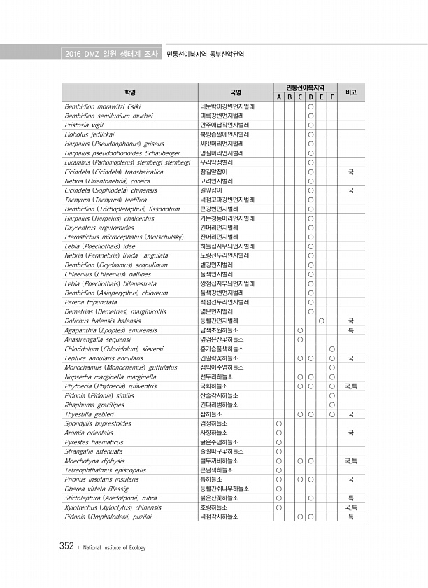 2016 DMZ 일원 생태계 조사 민통선이북지역 동부산악권역 352 ? National Institute of Ecology 학명 국명 민통선이북지역 비고 A B C D E F Bembidion morawitzi Csiki 네눈박이강변먼지벌레 ○ Bembidion semilunium muchei 미륵강변먼지벌레 ○ Pristosia vigil 만주애납작먼지벌레 ○ Lioholus jedlickai 북방좁쌀애먼지벌레 ○ Harpalus Pseudoophonus griseus 씨앗머리먼지벌레 ○ Harpalus pseudophonoides Schauberger 영실머리먼지벌레 ○ Eucarabus Parhomopterus sternbergi sternbergi 우리딱정벌레 ○ Cicindela Cicindela...