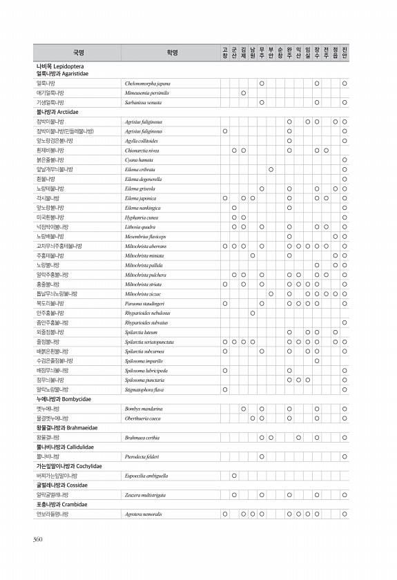 360 나비목 Lepidoptera 얼룩나방과 Agaristidae 얼룩나방 Chelonomorpha japana ○ ○ ○ 애기얼룩나방 Mimeusemia persimilis ○ 기생얼룩나방 Sarbanissa venusta ○ ○ ○ 불나방과 Arctiidae 점박이불나방 Agrisius fuliginosus ○ ○ ○ ○ ○ 점박이불나방 민들레불나방 Agrisius fuliginosus ○ ○ ○ 앞노랑검은불나방 Agylla collitoides ○ ○ 흰제비불나방 Chionarctia nivea ○ ○ ○ ○ ○ 붉은줄불나방 Cyana hamata ○ 앞날개무늬불나방 Eilema cribrata ○ ○ 흰불나방 Eilema degenerella ○ 노랑테불나방 Eilema griseola ○ ○ ○ ...