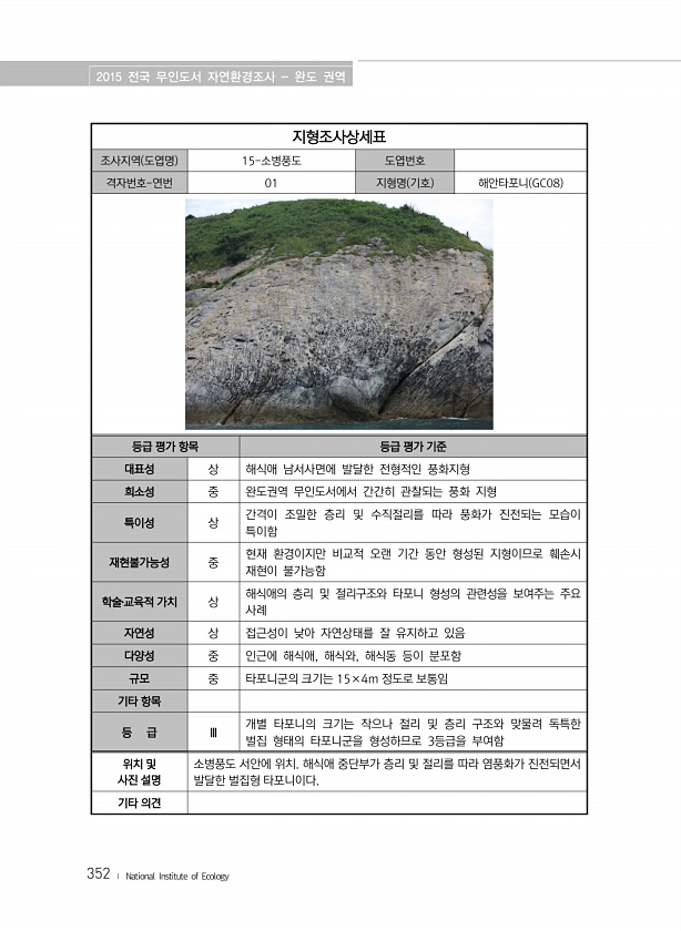 2015 전국 무인도서 자연환경조사 완도 권역 352 ? National Institute of Ecology 지형조사상세표 조사지역 도엽명 15-소병풍도 도엽번호 격자번호-연번 01 지형명 기호 해안타포니 GC08 등급 평가 항목 등급 평가 기준 대표성 상 해식애 남서사면에 발달한 전형적인 풍화지형 희소성 중 완도권역 무인도서에서 간간히 관찰되는 풍화 지형 특이성 상 간격이 조밀한 층리 및 수직절리를 따라 풍화가 진전되는 모습이 특이함 재현불가능성 중 현재 환경이지만 비교적 오랜 기간 동안 형성된 지형이므로 훼손시 재현이 불가능함 학술?교육적 가치 상 해식애의 층리 및 절리구조와 타포니 형성의 관련성을 보여주는 주요 사례 자연성 상 접근성이 낮아 자연상태를 잘 유지하고 있음 다양성 중 인근에 해식애, 해식...