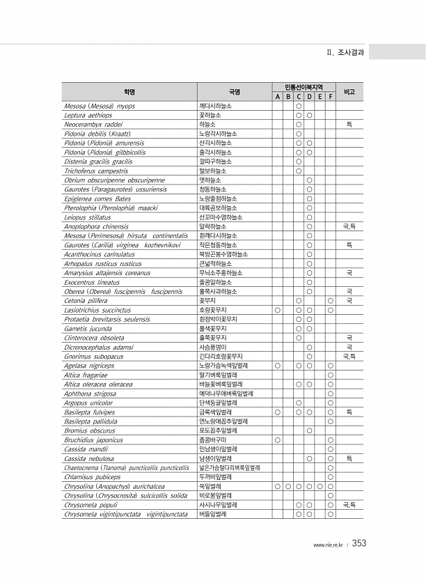 Ⅱ. 조사결과 www.nie.re.kr ? 353 학명 국명 민통선이북지역 비고 A B C D E F Mesosa Mesosa myops 깨다시하늘소 ○ Leptura aethiops 꽃하늘소 ○ ○ Neocerambyx raddei 하늘소 ○ 특 Pidonia debilis Kraatz 노랑각시하늘소 ○ Pidonia Pidonia amurensis 산각시하늘소 ○ ○ Pidonia Pidonia gilbbicollis 줄각시하늘소 ○ ○ Distenia gracilis gracilis 깔따구하늘소 ○ Trichoferus campestris 털보하늘소 ○ Obrium obscuripenne obscuripenne 엿하늘소 ○ Gaurotes Paragaurotes ussuriensis 청동하늘소 ○ Ep...