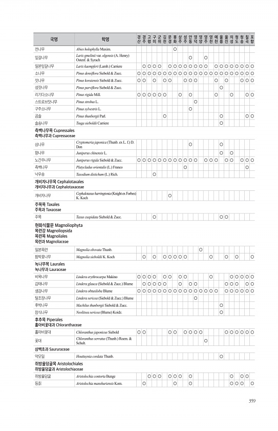 359 전나무 Abies holophylla Maxim. ○ 잎갈나무 Larix gmelinii var. olgensis A. Henry Ostenf. & Syrach ○ ○ 일본잎갈나무 Larix kaempferi Lamb. Carriere ○ ○ ○ ○ ○ ○ ○ ○ ○ ○ ○ ○ ○ ○ ○ ○ ○ ○ ○ ○ 소나무 Pinus densifora Siebold & Zucc. ○ ○ ○ ○ ○ ○ ○ ○ ○ ○ ○ ○ ○ ○ ○ ○ ○ ○ ○ ○ ○ ○ ○ 잣나무 Pinus koraiensis Siebold & Zucc. ○ ○ ○ ○ ○ ○ ○ ○ ○ ○ ○ ○ ○ 섬잣나무 Pinus parvifora Siebold & Zucc. ○ 리기다소나무 Pinus rigida Mill. ○ ○ ○ ○ ○ ○ ○ ...