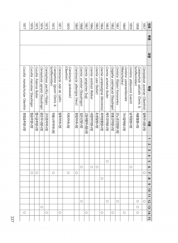 337 번호 목명 과명 학명 국명 1 2 3 4 5 6 7 8 9 10 11 12 13 14 15 1857 Clavipalpula aurariae Oberth?r 얼룩무늬밤나방 ○ ○ 1858 Colobochyla salicalis Denis & Schifferm?ller 세줄짤름나방 ○ ○ ○ 1859 Conistra albipuncta Leech 날개점밤나방 ○ 1860 Conistra castaneofasciata Motschulsky 가시알락밤나방 ○ 1861 Conistra filipjevi Kononenko 코노넨코점밤나방 ○ 1862 Corgatha costimacula Staudinger 분홍꼬마밤나방 ○ 1863 Cosmia achatina Butler 제주꼬마밤나방 ○ ○ 1864 Cosm...