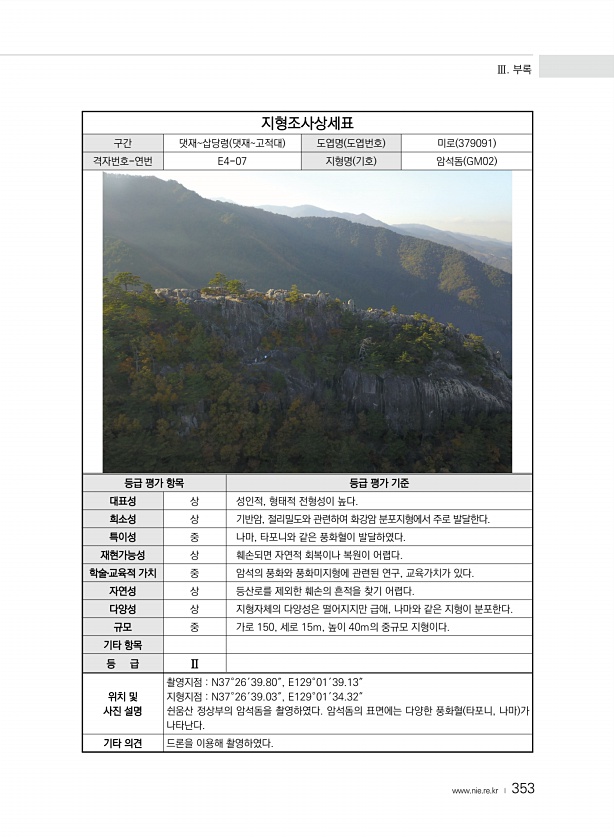 Ⅲ. 부록 www.nie.re.kr ? 353 지형조사상세표 구간 댓재삽당령 댓재고적대 도엽명 도엽번호 미로 379091 격자번호-연번 E4-07 지형명 기호 암석돔 GM02 등급 평가 항목 등급 평가 기준 대표성 상 성인적, 형태적 전형성이 높다. 희소성 상 기반암, 절리밀도와 관련하여 화강암 분포지형에서 주로 발달한다. 특이성 중 나마, 타포니와 같은 풍화혈이 발달하였다. 재현가능성 상 훼손되면 자연적 회복이나 복원이 어렵다. 학술?교육적 가치 중 암석의 풍화와 풍화미지형에 관련된 연구, 교육가치가 있다. 자연성 상 등산로를 제외한 훼손의 흔적을 찾기 어렵다. 다양성 상 지형자체의 다양성은 떨어지지만 급애, 나마와 같은 지형이 분포한다. 규모 중 가로 150, 세로 15m, 높이 40m의 중규모 지형이다...