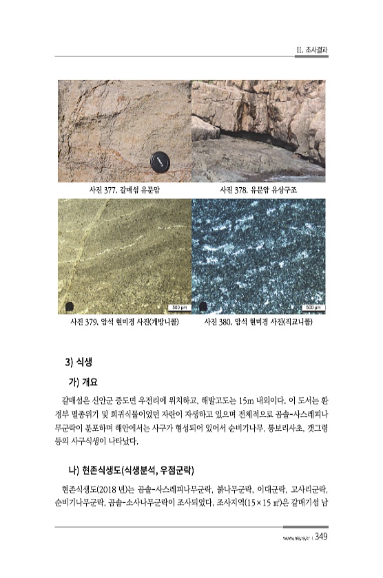 II. 조사결과 www.nie.re.kr ?349 사진 377. 갈매섬 유문암 사진 378. 유문암 유상구조 사진 379. 암석 현미경 사진 개방니콜 사진 380. 암석 현미경 사진 직교니콜 3 갈매섬은 신안군 증도면 우전리에 위치하고, 해발고도는 15m 내외이다. 이 도서는 환 경부 멸종위기 및 희귀식물이었던 자란이 자생하고 있으며 전체적으로 곰솔-사스레피나 무군락이 분포하며 해안에서는 사구가 형성되어 있어서 순비기나무, 통보리사초, 갯그령 등의 사구식생이 나타났다. , 현존식생도 2018 년 는 곰솔-사스레피나무군락, 붉나무군락, 이대군락, 고사리군락, 순비기나무군락, 곰솔-소사나무군락이 조사되었다. 조사지역 15×15 ㎡ 은 갈매기섬남