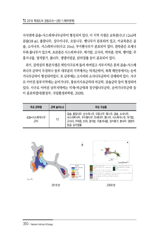 2018 특정도서 정밀조사 신안 1 북부권역 350 ? National Institute of Ecology 서사면에 곰솔-사스레피나무군락이 형성되어 있다. 이 지역 식생은 교목층 수고 12m 에 곰솔 18 ㎝ , 졸참나무, 상수리나무, 오동나무, 팽나무가 분포되어 있고, 아교목층은 곰 솔, 소사나무, 사스레피나무 수고 10m , 꾸지뽕나무가 분포되어 있다. 관목층은 모새나 무와 붉나무가 있으며, 초본층은 사스레피나무, 애기탑, 고사리, 까마중, 반하, 괭이밥, 주 홍서나물, 멍석딸기, 붉나무, 댕댕이덩굴, 닭의장풀 등이 분포되어 있다. 과거, 갈매섬의 현존식생은 해안사구로써 둘러 싸여있고 서부지역은 흔히 곰솔-사스레 피나무 군락이 우점하나 동부 대부분의 지역에서는 억새군락이, 북쪽 해안부에서는 순비 기나무...