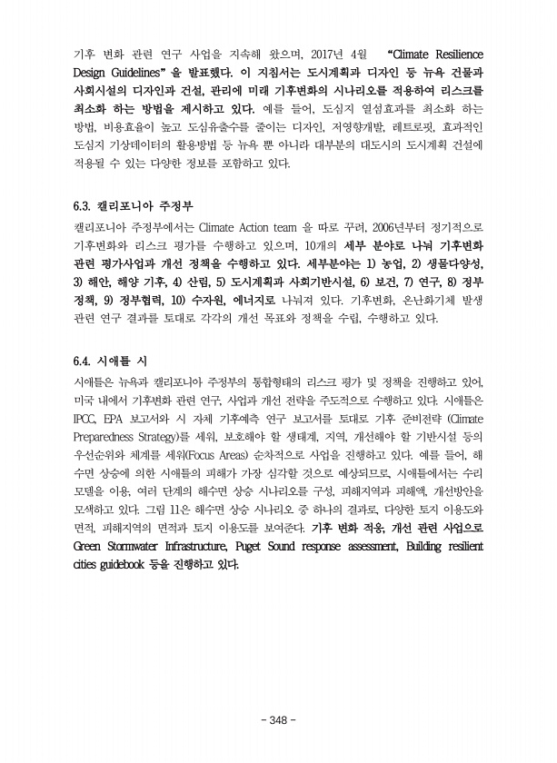 기후 변화 관련 연구 사업을 지속해 왔으며, 2017년 4월 “Climate Resilience Design Guidelines” 을 발표했다. 이 지침서는 도시계획과 디자인 등 뉴욕 건물과 사회시설의 디자인과 건설, 관리에 미래 기후변화의 시나리오를 적용하여 리스크를 최소화 하는 방법을 제시하고 있다. 예를 들어, 도심지 열섬효과를 최소화 하는 방법, 비용효율이 높고 도심유출수를 줄이는 디자인, 저영향개발, 레트로핏, 효과적인 도심지 기상데이터의 활용방법 등 뉴욕 뿐 아니라 대부분의 대도시의 도시계획 건설에 적용될 수 있는 다양한 정보를 포함하고 있다. 6.3. 캘리포니아 주정부 캘리포니아 주정부에서는 Climate Action team 을 따로 꾸려, 2006년부터 정기적으로 기후변화와 리스크 평가를 수...