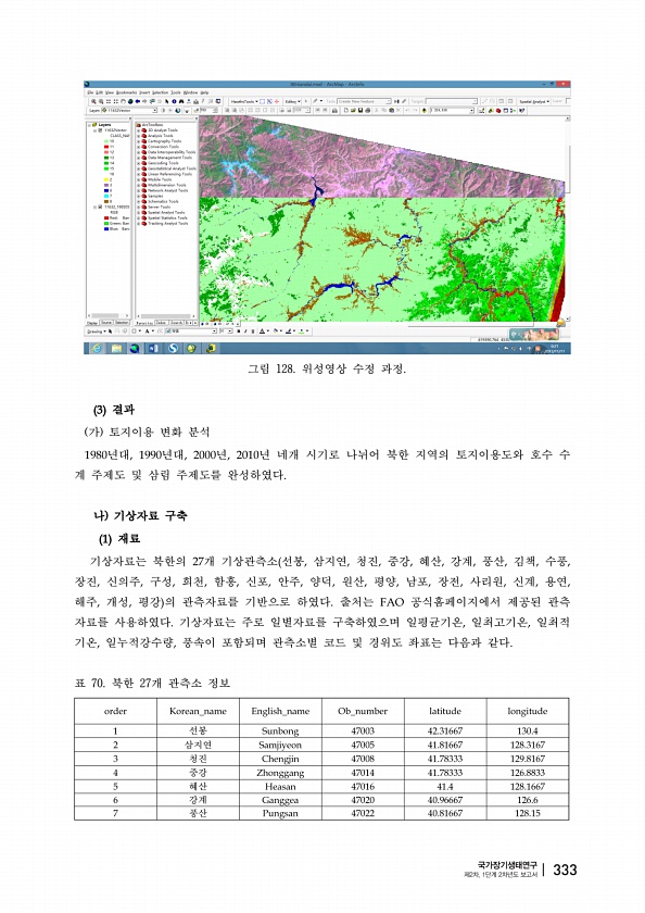 선봉 삼지연 청진 중강 혜산 강계 풍산 표 70. 북한 27개 관측소 정보 그림 128. 위성영상 수정 과정. 결과 가 토지이용 변화 분석 년대 년대 년 년 네개 시기로 나뉘어 북한 지역의 토지이용도와 호수 수 계 주제도 및 삼림 주제도를 완성하였다 나 기상자료 구축 재료 기상자료는 북한의 개 기상관측소 선봉 삼지연 청진 중강 혜산 강계 풍산 김책 수풍 장진 신의주 구성 희천 함흥 신포 안주 양덕 원산 평양 남포 장전 사리원 신계 용연 해주 개성 평강 의 관측자료를 기반으로 하였다 출처는 공식홈페이지에서 제공된 관측 자료를 사용하였다 기상자료는 주로 일별자료를 구축하였으며 일평균기온 일최고기온 일최적 기온 일누적강수량 풍속이 포함되며 관측소별 코드 및 경위도 좌표는 다음과 같다 국가장기생태연구 제2차, 1단...