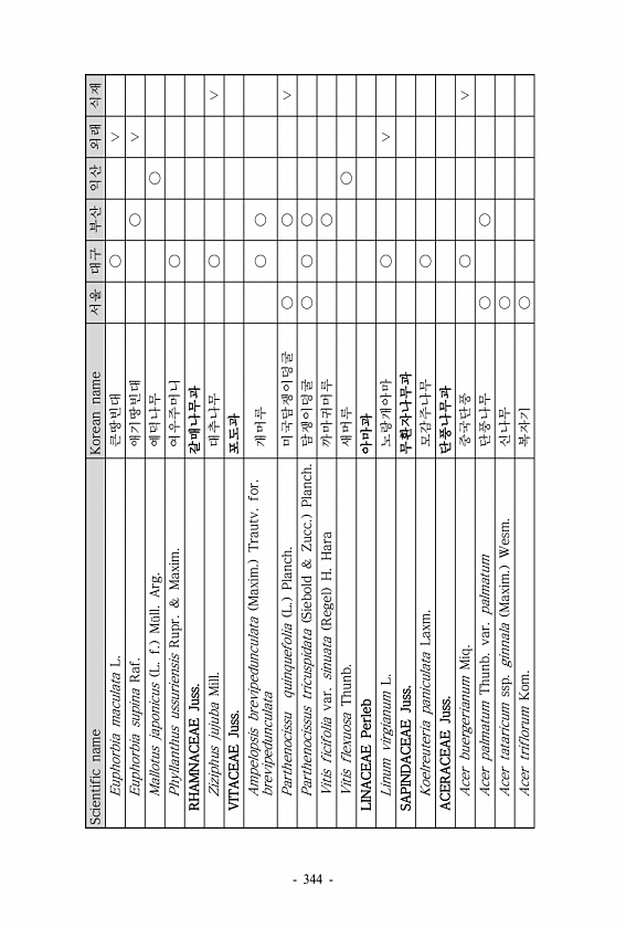 Scientific name Korean name 서울 대구 부산 익산 외래 식재 Euphorbia maculata L. 큰땅빈대 ○ ∨ Euphorbia supina Raf. 애기땅빈대 ○ ∨ Mallotus japonicus L. f. M?ll. Arg. 예덕나무 ○ Phyllanthus ussuriensis Rupr. & Maxim. 여우주머니 ○ RHAMNACEAE Juss. 갈매나무과 Ziziphus jujuba Mill. 대추나무 ○ ∨ VITACEAE Juss. 포도과 Ampelopsis brevipedunculata Maxim. Trautv. for. brevipedunculata 개머루 ○ ○ Parthenocissu quinque...