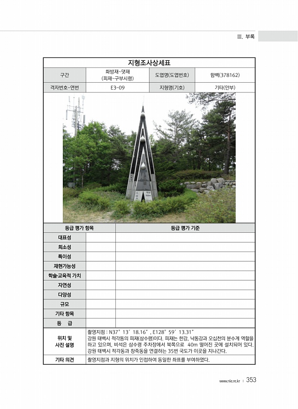 Ⅲ. 부록 www.nie.re.kr ? 353 지형조사상세표 구간 화방재댓재 피재구부시령 도엽명 도엽번호 함백 378162 격자번호-연번 E3-09 지형명 기호 기타 안부 등급 평가 항목 등급 평가 기준 대표성 희소성 특이성 재현가능성 학술?교육적 가치 자연성 다양성 규모 기타 항목 등 급 위치 및 사진 설명 촬영지점 N37°13′18.16″, E128°59′13.31″ 강원 태백시 적각동의 피재 삼수령 이다. 피재는 한강, 낙동강과 오십천의 분수계 역할을 하고 있으며, 비석은 삼수령 주차장에서 북쪽으로 40m 떨어진 곳에 설치되어 있다. 강원 태백시 적각동과 창죽동을 연결하는 35번 국도가 이곳을 지나간다. 기타 의견 촬영지점과 지형의 위치가 인접하여 동일한 좌표를부여하였다.