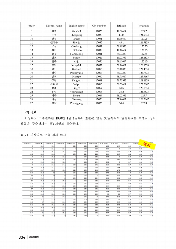 김책 수풍 장진 신의주 구성 희천 함흥 신포 안주 양덕 원산 평양 남포 장전 사리원 신계 용연 해주 개성 평강 결과 기상자료 구축결과는 년 월 일부터 년 월 일까지의 일별자료를 엑셀로 정리 하였다 구축결과는 첨부파일로 제출한다 표 71. 기상자료 구축 결과 예시 334|국립생태원
