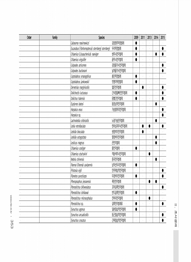 353 Order Family Species 2009 2011 2013 2014 2015 Calosoma maximowiczi 검정명주딱정벌레 ● Eucarabus Parhomopterus sternbergi sternbergi 우리딱정벌레 ● ● Chlaenius Lissauchenius naeviger 쌍무늬먼지벌레 ● ● ● Chlaenius virgulifer 끝무늬먼지벌레 ● Colpodes atricomes 검정끝가시먼지벌레 ● Colpodes buchanani 날개끝가시먼지벌레 ● Coptolabrus smaragdinus 홍단딱정벌레 ● Coptolabrus jankowskii 멋쟁이딱정벌레 ...