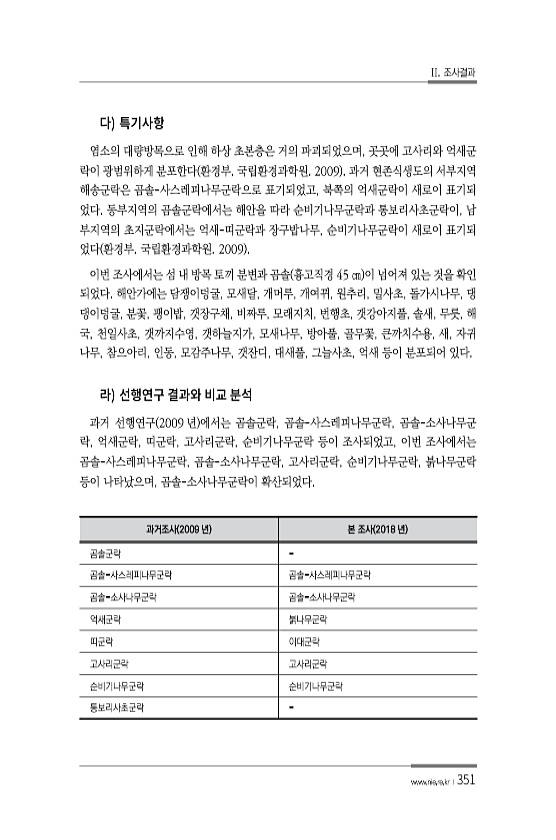 II. 조사결과 www.nie.re.kr ?351 염소의 대량방목으로 인해 하상 초본층은 거의 파괴되었으며, 곳곳에 고사리와 억새군 락이 광범위하게 분포한다 환경부. 국립환경과학원. 2009 과거 현존식생도의 서부지역 해송군락은 곰솔-사스레피나무군락으로 표기되었고, 북쪽의 억새군락이 새로이 표기되 었다. 동부지역의 곰솔군락에서는 해안을 따라 순비기나무군락과 통보리사초군락이, 남 부지역의 초지군락에서는 억새-띠군락과 장구밥나무, 순비기나무군락이 새로이 표기되 었다 환경부. 국립환경과학원. 2009 이번 조사에서는 섬 내 방목 토끼 분변과 곰솔 흉고직경 45 ㎝ 이 넘어져 있는 것을 확인 되었다. 해안가에는 담쟁이덩굴, 모새달, 개머루, 개여뀌, 원추리, 밀사초, 돌가시나무, 댕 댕이덩굴, 분꽃, 괭이밥, 갯장...