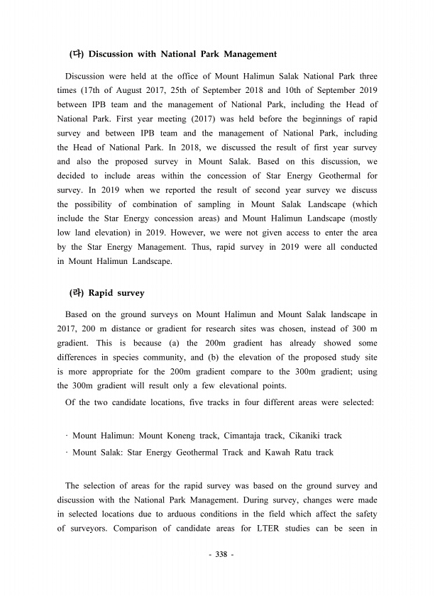 338 Discussion with National Park Management Discussion were held at the office of Mount Halimun Salak National Park three times 17th of August 2017, 25th of September 2018 and 10th of September 2019 between IPB team and the management of National Park, including the Head of National Park. First year meeting 2017 was held before the beginnings of rapid survey and between IPB team and the managemen...