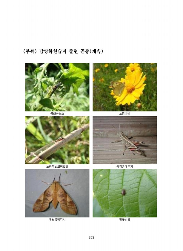 353 부록 담양하천습지 출현 곤충 계속 국화하늘소 노랑나비 노랑무늬의병벌레 등검은메뚜기 무늬콩박각시알꽃벼룩
