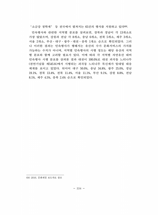 334 ‘소금강 청학제’ 등 전국에서 펼쳐지는 65건의 행사를 지원하고 있다68 민속행사와 관련한 지역별 분포를 살펴보면, 경북과 경남이 각 13개소로 가장 많았으며, 강원과 전남 각 8개소, 충남 6개소, 전북 5개소, 제주 3개소, 서울 2개소, 부산·대구·광주·대전·충북 1개소 순으로 확인되었다. 그러 나 이러한 결과는 민속행사가 행해지는 유산의 수가 문화서비스의 가치를 가늠하는 수치가 아니며, 지역별 민속행사의 시행 정도는 해당 유산의 지역 별 분포와 함께 고려할 필요가 있다. 이에 따라 각 지역별 자연유산 대비 민속행사 시행 분포를 살펴본 결과 대전이 100.0%로 대전 괴곡동 느티나무 천연기념물 제545호 에서 시행되는 괴곡동 느티나무 목신제가 일대일 대응 체계를 보이고 있었다. 뒤이어 대구 50...
