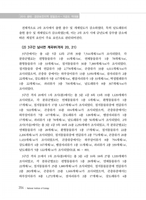 2015 생태·경관보전지역 정밀조사 거금도 적대봉 354 ? National Institute of Ecology 전체적으로 2차 조사에서 출현 종수 및 개체밀도가 감소하였다. 특히 날도래류의 출현 종수 및 개체밀도가 감소하였는데, 이는 2차 조사 시에 금년도에 강우량 감소에 따른 계절적 요인이 주요 요인으로 판단되어진다. 2 3구간 남사면 계곡부 격자 20, 21 3구간에서는 총 4문 5강 12목 27과 39종 7,544개체/4㎡가 조사되었다. 각 분류군별로는 편형동물류가 1종 44개체/4㎡, 연체동물류가 1종 78개체/4㎡, 환형동물류가 1종 33개체/4㎡, 절지동물류가 36종 7,389개체/4㎡가 조사되었다. 절지동물류 중에 연갑류가 3종 2,778개체/4㎡, 곤충류가 33종 4,611개체/4㎡가 조사...