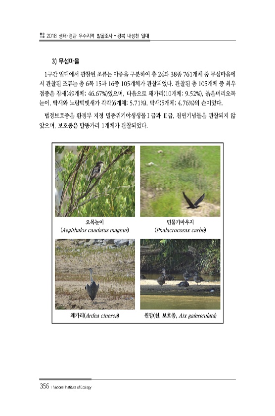2018 생태·경관 우수지역 발굴조사 경북 내성천 일대 356 ? National Institute of Ecology 3 1구간 일대에서 관찰된 조류는 아종을 구분하여 총 24과 38종 761개체 중 무섬마을에 서 관찰된 조류는 총 6목 15과 16종 105개체가 관찰되었다. 관찰된 총 105개체 중 최우 점종은 참새 49개체; 46.67% 였으며, 다음으로 왜가리 10개체; 9.52% , 붉은머리오목 눈이, 딱새와 노랑턱멧새가 각각 6개체; 5.71% , 박새 5개체; 4.76% 의 순이었다. 법정보호종은 환경부 지정 멸종위기야생생물Ⅰ급과 Ⅱ급, 천연기념물은 관찰되지 않 았으며, 보호종은 말똥가리 1개체가 관찰되었다. 오목눈이 Aegithalos caudatus magnus 민물가마우지 Phalacroc...