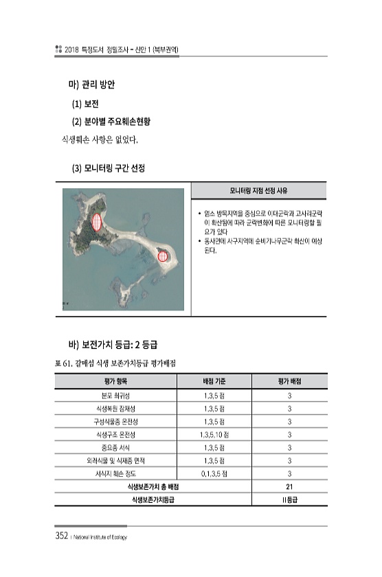 2018 특정도서 정밀조사 신안 1 북부권역 352 ? National Institute of Ecology 1 2 식생훼손 사항은 없었다. 3 모니터링 지점 선정 사유 ? 염소 방목지역을 중심으로 이대군락과 고사리군락 이 확산됨에 따라 군락변화에 따른 모니터링할 필 요가 있다 ? 동사면에 사구지역에 순비기나무군락 확산이 예상 된다. 2 평가 항목 배점 기준 평가 배점 분포 희귀성 1,3,5 점 3 식생복원 잠재성 1,3,5 점 3 구성식물종 온전성 1,3,5 점 3 식생구조 온전성 1,3,5,10 점 3 중요종 서식 1,3,5 점 3 외래식물 및 식재종 면적 1,3,5 점 3 서식지 훼손 정도 0,1,3,5 점 3 식생보존가치 총 배점 21 식생보존가치등급 Ⅱ등급 표 61. 갈매섬 식생 보존가치등급평가배점