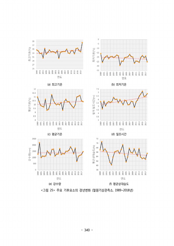 340 a 최고기온 b 최저기온 c 평균기온 d 일조시간 e 강수량 f 평균상대습도 그림 25 주요 기후요소의 경년변화 철원기상관측소 , 19892018년