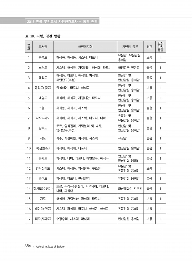 2015 전국 무인도서 자연환경조사 통영 권역 356 ? National Institute of Ecology 번호 도서명 해안미지형 기반암 종류 경관 보전 가치 등급 1 충복도 해식곡, 해식동, 시스텍, 타포니 유문암, 유문암질 응회암 보통 Ⅱ 2 소덕도 시스텍, 해식곡, 자갈해안, 해식애, 타포니 하양층군 진동층 좋음 Ⅰ 3 해갑도 해식동, 타포니, 해식애, 파식대, 해안단구 추정 안산암 및 안산암질 응회암 좋음 Ⅰ 4 동장도 동도 암석해안, 타포니, 해식곡 안산암 및 안산암질 응회암 보통 Ⅱ 5 대혈도 해식애, 해식곡, 자갈해안, 타포니 안산암 및 안산암질 응회암 보통 Ⅱ 6 소혈도 해식동, 해식곡, 시스텍 안산암 및 안산암질 응회암 좋음 Ⅰ 7 자사리제도 해식애, 해식곡, 시스텍, 타포니, 나마 유문...