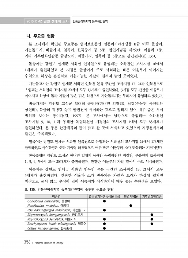 2015 DMZ 일원 생태계 조사 민통선이북지역 동부해안권역 356 ? National Institute of Ecology 나. 주요종 현황 본 조사에서 확인된 주요종은 법적보호종인 멸종위기야생생물 II급 어류 돌상어, 가는돌고기, 버들가지, 열목어, 한둑중개 등 5종, 천연기념물 제259호 어름치 1종, 기타 기후변화민감종 금강모치, 버들가지, 열목어 등 3종으로 판단된다 표 135 돌상어는 강원도 인제군 서화면 인북천으로 유입되는 소하천인 조사지점 16에서 1개체가 출현하였고 본 지점은 돌상어가 주로 서식하는 빠른 여울부가 이어지는 수역으로 하상은 은신처로 이용가능한 자갈이 겹쳐져 놓인 곳이었다. 가는돌고기는 강원도 인제군 서화면 인북천 본류 구간인 조사지점 17, 21과 인북천으로 유입되는 서화천의 ...