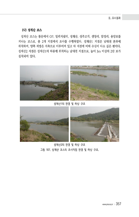Ⅱ. 조사결과 www.nie.re.kr ? 357 나 성재산 코스 성재산 코스는 통문에서 OP, 얼레지쉼터, 성재산, 성주고개, 생창리, 암정리, 용양보를 지나는 코스로, 총 2개 지점에서 조사를 수행하였다. 성재산1 지점은 남대천 본류에 위치하며, 양쪽 제방은 석축으로 이루어져 있고 타 지점에 비해 수심이 다소 깊은 편이다. 성재산2 지점은 성재산1의 하류에 위치하는 남대천 지점으로, 높이 3m 이상의 2단 보가 설치되어 있다. 성재산1의 전경 및 하상 구조 성재산2의 전경 및 하상 구조 그림 107. 성재산 코스의 조사지점 전경 및 하상구조.