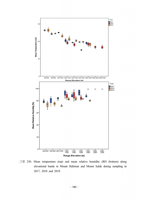 340 230. Mean temperature top and mean relative humidity RH bottom along elevational bands in Mount Halimun and Mount Salak during sampling in 2017, 2018 and2019.