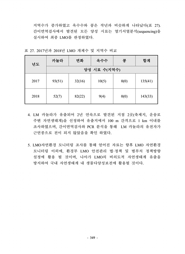 349 지역수가 증가하였고 옥수수와 콩은 작년과 비슷하게 나타났다 표 27 간이면역검사에서 발견된 모든 양성 시료는 염기서열분석 sequencing 을 실시하여 최종 LMO를 판정하였다. 표 27. 2017년과 2018년 LMO 개체수 및 지역수 비교 년도 카놀라 면화 옥수수 콩 합계 양성 시료 수 지역수 2017 93 51 32 16 10 5 0 0 135 41 2018 52 7 82 22 9 4 0 0 143 33 4. LM 카놀라가 유출되어 2년 연속으로 발견된 지점 2곳 축제지, 운송로 주변 자연생태계 을 선정하여 유출지에서 100 m 간격으로 1 km 이내를 조사하였으며, 간이면역검사와 PCR 분석을 통해 LM 카놀라의 유전자가 근연종으로 전이 되지 않았음을 확인 하였다. 5. LMO자연환경 모니터...