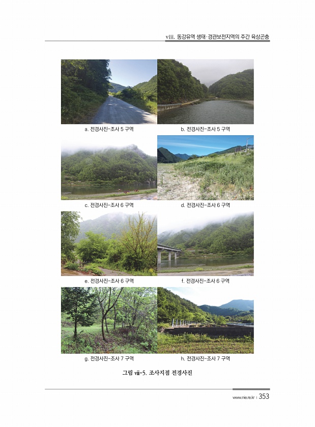 viii. 동강유역 생태·경관보전지역의 주간 육상곤충 www.nie.re.kr ?353 a. 전경사진-조사 5 구역 b. 전경사진-조사 5 구역 c. 전경사진-조사 6 구역 d. 전경사진-조사 6 구역 e. 전경사진-조사 6 구역 f. 전경사진-조사 6 구역 g. 전경사진-조사 7 구역 h. 전경사진-조사 7 구역 그림 ⅷ-5. 조사지점전경사진