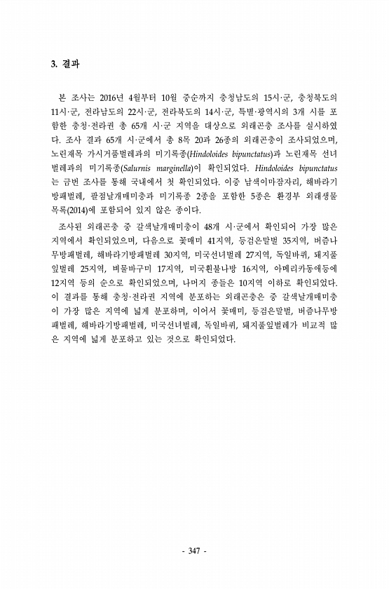 347 3. 결과 본 조사는 2016년 4월부터 10월 중순까지 충청남도의 15시·군, 충청북도의 11시·군, 전라남도의 22시·군, 전라북도의 14시·군, 특별·광역시의 3개 시를 포 함한 충청·전라권 총 65개 시·군 지역을 대상으로 외래곤충 조사를 실시하였 다. 조사 결과 65개 시·군에서 총 8목 20과 26종의 외래곤충이 조사되었으며, 노린재목 가시거품벌레과의 미기록종 Hindoloides bipunctatus 과 노린재목 선녀 벌레과의 미기록종 Salurnis marginella 이 확인되었다. Hindoloides bipunctatus 는 금번 조사를 통해 국내에서 첫 확인되었다. 이중 남색이마잠자리, 해바라기 방패벌레, 팔점날개매미충과 미기록종 2종을 포함한 5종은 환경부 외래생물 목록 201...