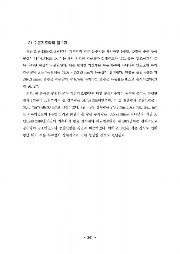 341 지난 년 년 간의 기후학적 평균 물수지를 확인하면 월 월에 수분 부족 30 19892018 16 , 10 현상이 나타났다 표 이는 해당 기간에 강우량과 상대습도가 낮고 풍속 일조시간이 높 5 , 아 나타난 현상이라 판단된다 이를 제외한 기간에는 수분 부족이 나타나지 않았으며 특히 강우량이 많은 월에는 79 42.02 293.29 mm의 유출량이 발생했다 연평균 증발산량은 약 896.63 mm로 연평균 강우량의 약 를 차지하고 연평균 유출률은 로 분석되었다 그 65% 0.35 림 26, 27 또한 본 조사를 수행한 조사 기간인 년에 대한 수문기후학적 물수지 분석을 수행한 , 2019 결과 월부터 월까지의 총 강우량은 1 10 847.54 mm , 이었으며 그 중 유출량과 증발산량은 ? 40.43 mm ...