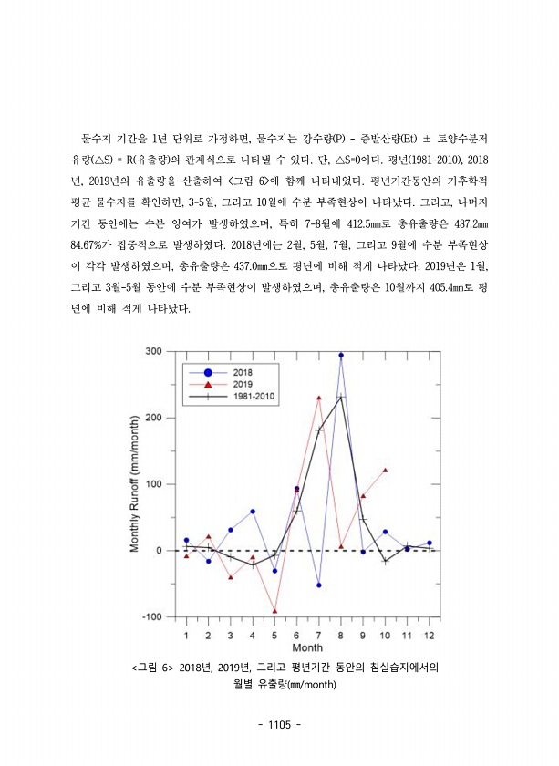 1105 물수지 기간을 1년 단위로 가정하면, 물수지는 강수량 P 증발산량 Et ± 토양수분저 유량 △S = R 유출량 의 관계식으로 나타낼 수 있다. 단, △S=0이다. 평년 1981-2010 , 2018 년, 2019년의 유출량을 산출하여 그림 6 에 함께 나타내었다. 평년기간동안의 기후학적 평균 물수지를 확인하면, 3-5월, 그리고 10월에 수분 부족현상이 나타났다. 그리고, 나머지 기간 동안에는 수분 잉여가 발생하였으며, 특히 7-8월에 412.5㎜로 총유출량은 487.2㎜ 84.67%가 집중적으로 발생하였다. 2018년에는 2월, 5월, 7월, 그리고 9월에 수분 부족현상 이 각각 발생하였으며, 총유출량은 437.0㎜으로 평년에 비해 적게 나타났다. 2019년은 1월, 그리고 3월-5월 동안에 수분...