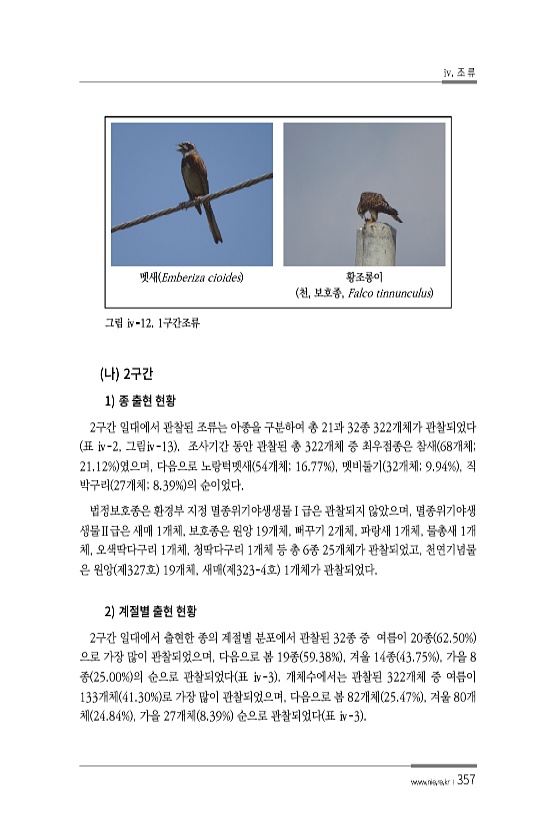 iv. 조 류 www.nie.re.kr ? 357 멧새 Emberiza cioides 황조롱이 천, 보호종, Falco tinnunculus 그림 ⅳ-12. 1구간조류 2 1 2구간 일대에서 관찰된 조류는 아종을 구분하여 총 21과 32종 322개체가 관찰되었다 표 ⅳ-2, 그림ⅳ-13 조사기간 동안 관찰된 총 322개체 중 최우점종은 참새 68개체; 21.12% 였으며, 다음으로 노랑턱멧새 54개체; 16.77% , 멧비둘기 32개체; 9.94% , 직 박구리 27개체; 8.39% 의 순이었다. 법정보호종은 환경부 지정 멸종위기야생생물Ⅰ급은 관찰되지 않았으며, 멸종위기야생 생물Ⅱ급은 새매 1개체, 보호종은 원앙 19개체, 뻐꾸기 2개체, 파랑새 1개체, 물총새 1개 체, 오색딱다구리 1개체, 청딱다구리 1...