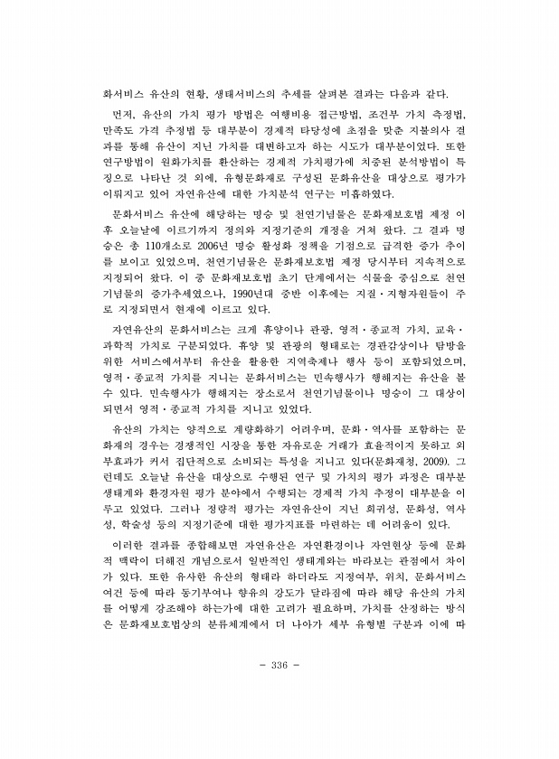 336 화서비스 유산의 현황, 생태서비스의 추세를 살펴본 결과는 다음과 같다. 먼저, 유산의 가치 평가 방법은 여행비용 접근방법, 조건부 가치 측정법, 만족도 가격 추정법 등 대부분이 경제적 타당성에 초점을 맞춘 지불의사 결 과를 통해 유산이 지닌 가치를 대변하고자 하는 시도가 대부분이었다. 또한 연구방법이 원화가치를 환산하는 경제적 가치평가에 치중된 분석방법이 특 징으로 나타난 것 외에, 유형문화재로 구성된 문화유산을 대상으로 평가가 이뤄지고 있어 자연유산에 대한 가치분석 연구는 미흡하였다. 문화서비스 유산에 해당하는 명승 및 천연기념물은 문화재보호법 제정 이 후 오늘날에 이르기까지 정의와 지정기준의 개정을 거쳐 왔다. 그 결과 명 승은 총 110개소로 2006년 명승 활성화 정책을 기점으로 급격한 증가 ...