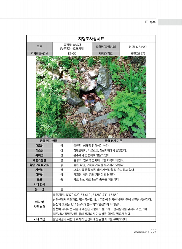 Ⅲ. 부록 www.nie.re.kr ? 357 지형조사상세표 구간 묘적재화방재 늦은목이도래기재 도엽명 도엽번호 남대 378154 격자번호-연번 E6-02 지형명 기호 용천 GS27 등급 평가 항목 등급 평가 기준 대표성 상 성인적, 형태적 전형성이 높다. 희소성 상 하천발원지, 카르스트, 화산지형에서 발달한다. 특이성 상 분수계와 인접하여 발달하였다. 재현가능성 상 환경적, 인위적 변화에 의한 회복이 어렵다. 학술?교육적 가치 중 높은 학술, 교육적 가치를 부여하기 어렵다. 자연성 상 보호시설 등을 설치하여 자연성을 잘 유지하고 있다. 다양성 상 암괴원, 핵석 등의 지형이 발견된다. 규모 중 가로 1m, 세로 1m의 중규모 지형이다. 기타 항목 등 급 Ⅱ 위치 및 사진 설명 촬영지점 N37°02′33.61″...