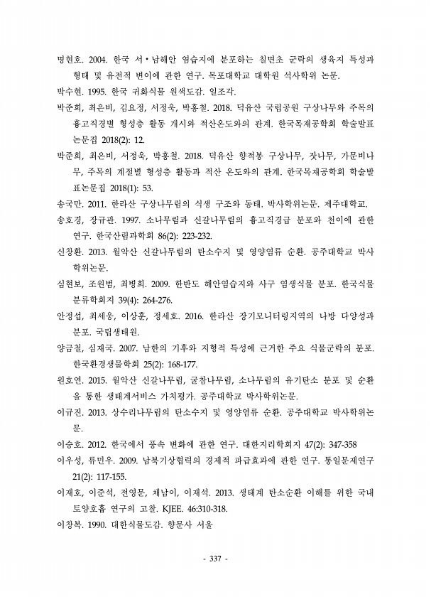 337 명현호. 2004. 한국 서?남해안 염습지에 분포하는 칠면초 군락의 생육지 특성과 형태 및 유전적 변이에 관한 연구. 목포대학교 대학원 석사학위 논문. 박수현. 1995. 한국 귀화식물 원색도감. 일조각. 박준희, 최은비, 김요정, 서정욱, 박홍철. 2018. 덕유산 국립공원 구상나무와 주목의 흉고직경별 형성층 활동 개시와 적산온도와의 관계. 한국목재공학회 학술발표 논문집 2018 2 12. 박준희, 최은비, 서정욱, 박홍철. 2018. 덕유산 향적봉 구상나무, 잣나무, 가문비나 무, 주목의 계절별 형성층 활동과 적산 온도와의 관계. 한국목재공학회 학술발 표논문집 2018 1 53. 송국만. 2011. 한라산 구상나무림의 식생 구조와 동태. 박사학위논문. 제주대학교. 송호경, 장규관. 1997. 소나...