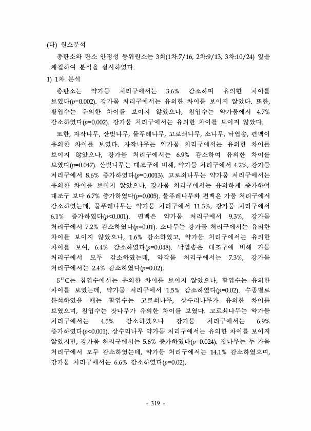 319 다 원소분석 총탄소와 탄소 안정성 동위원소는 3회 1차7/16, 2차9/13, 3차10/24 잎을 채집하여 분석을 실시하였다. 1 1차 분석 총탄소는 약가뭄 처리구에서는 3.6% 감소하며 유의한 차이를 보였다 p=0.002 강가뭄 처리구에서는 유의한 차이를 보이지 않았다. 또한, 활엽수는 유의한 차이를 보이지 않았으나, 침엽수는 약가뭄에서 4.7% 감소하였다 p=0.002 강가뭄 처리구에서는 유의한 차이를 보이지 않았다. 또한, 자작나무, 산벚나무, 물푸레나무, 고로쇠나무, 소나무, 낙엽송, 편백이 유의한 차이를 보였다. 자작나무는 약가뭄 처리구에서는 유의한 차이를 보이지 않았으나, 강가뭄 처리구에서는 6.9% 감소하여 유의한 차이를 보였다 p=0.047 산벚나무는 대조구에 비해, 약가뭄 처리구에서 ...