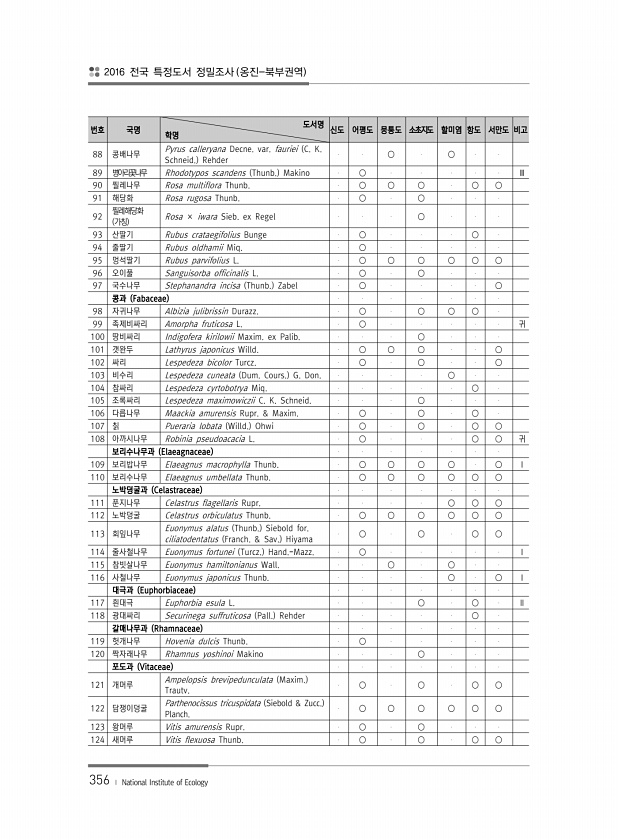 2016 전국 특정도서 정밀조사 옹진-북부권역 356 ? National Institute of Ecology 번호 국명 도서명 학명 신도 어평도 뭉퉁도 소초지도 할미염 항도 서만도 비고 88 콩배나무 Pyrus calleryana Decne. var. fauriei C. K. Schneid. Rehder ○ ○ 89 병아리꽃나무 Rhodotypos scandens Thunb. Makino ○ Ⅲ 90 찔레나무 Rosa multiflora Thunb. ○ ○ ○ ○ ○ 91 해당화 Rosa rugosa Thunb. ○ ○ 92 찔레해당화 가칭 Rosa × iwara Sieb. ex Regel ○ 93 산딸기 Rubus cr...