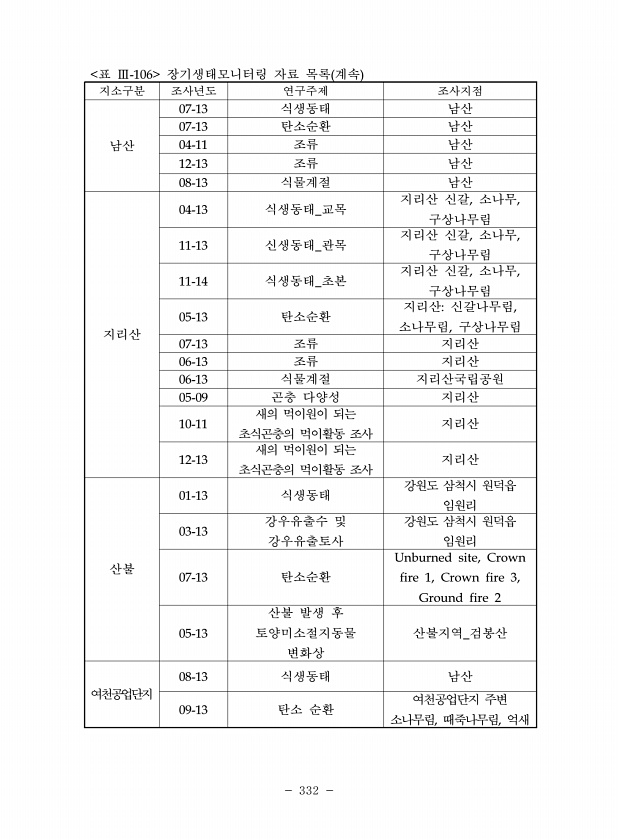 332 표 Ⅲ-106 장기생태모니터링 자료 목록 계속 지소구분 조사년도 연구주제 조사지점 남산 07-13 식생동태 남산 07-13 탄소순환 남산 04-11 조류 남산 12-13 조류 남산 08-13 식물계절 남산 지리산 04-13 식생동태_교목 지리산 신갈, 소나무, 구상나무림 11-13 신생동태_관목 지리산 신갈, 소나무, 구상나무림 11-14 식생동태_초본 지리산 신갈, 소나무, 구상나무림 05-13 탄소순환 지리산신갈나무림, 소나무림, 구상나무림 07-13 조류 지리산 06-13 조류 지리산 06-13 식물계절 지리산국립공원 05-09 곤충 다양성 지리산 10-11 새의 먹이원이 되는 초식곤충의 먹이활동 조사 지리산 12-13 새의 먹이원이 되는 초식곤충의 먹이활동 조사 지리산 산불 01-13 식생동태...