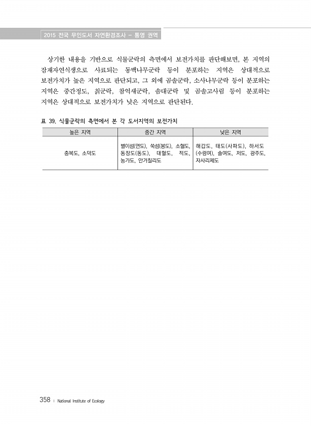 2015 전국 무인도서 자연환경조사 통영 권역 358 ? National Institute of Ecology 상기한 내용을 기반으로 식물군락의 측면에서 보전가치를 판단해보면, 본 지역의 잠재자연식생으로 사료되는 동백나무군락 등이 분포하는 지역은 상대적으로 보전가치가 높은 지역으로 판단되고, 그 외에 곰솔군락, 소사나무군락 등이 분포하는 지역은 중간정도, 칡군락, 참억새군락, 솜대군락 및 곰솔고사림 등이 분포하는 지역은 상대적으로 보전가치가 낮은 지역으로 판단된다. 표 39. 식물군락의 측면에서 본 각 도서지역의 보전가치 높은 지역 중간 지역 낮은 지역 충복도, 소덕도 별이섬 연도 , 쑥섬 봉도 , 소혈도, 동장도 동도 , 대혈도, 적도, 농가도, 안거칠리도 해갑도, 태도 사파도 , 하서도 수렁여 , 솔여도...