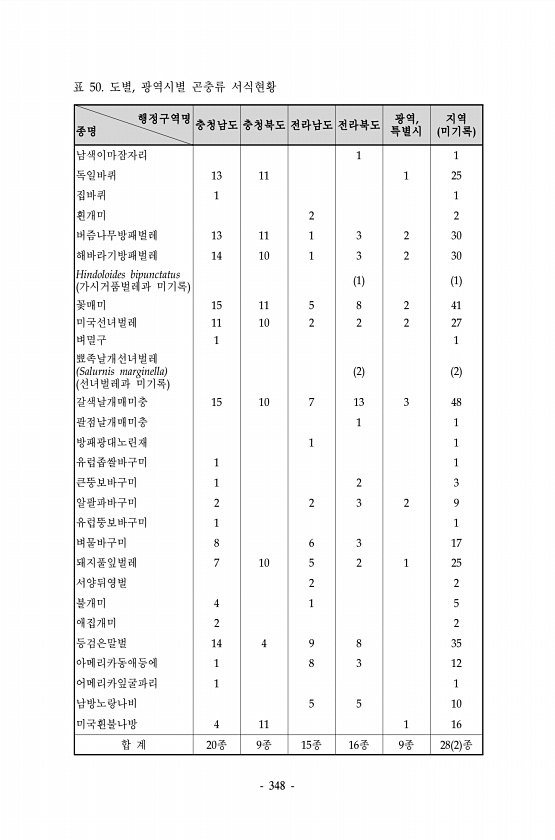 348 표 50. 도별, 광역시별 곤충류 서식현황 행정구역명 종명 충청남도 충청북도 전라남도 전라북도 특광별역시, 미지기역록 남색이마잠자리 1 1 독일바퀴 13 11 1 25 집바퀴 1 1 흰개미 2 2 버즘나무방패벌레 13 11 1 3 2 30 해바라기방패벌레 14 10 1 3 2 30 Hindoloides bipunctatus 가시거품벌레과 미기록 1 1 꽃매미 15 11 5 8 2 41 미국선녀벌레 11 10 2 2 2 27 벼멸구 1 1 뾰족날개선녀벌레 Salurnis marginella 선녀벌레과 미기록 2 2 갈색날개매미충 15 10 7 13 3 48 팔점날개매미충 1 1 방패광대노린재 1 1 유럽좁쌀바구미 1 1 큰뚱보바구미 1 2 3 알팔파바구미 2 2 3 2 9 유럽뚱보바구미 1 1 벼물바구...