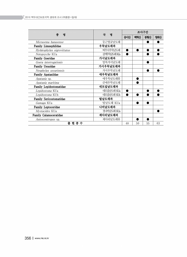 2016 백두대간보호지역 생태계 조사 추풍령밀재 356Ⅰwww.nie.re.kr 종 명 국 명 조사구간 웅이산 백학산 봉황산 청화산 Micrasema hanasense 둥근얼굴날도래 ● ● Family Limnephilidae 우묵날도래과 Hydatophylax nigrovittatus 띠무늬우묵날도래 ● ● ● ● Notopsyche KUa 갈색우묵날도래KUa ● ● ● Family Goeridae 가시날도래과 Goera interrogationis 알록가시날도래 ● Family Uenoidae 가시우묵날도래과 Neophylax ussuriensis 가시우묵날도래 ● ● Family Apataniidae 애우묵날도래과 Apatania sp. 애우묵날도래류 ● Apatania maritima 큰애우묵날도래 ...