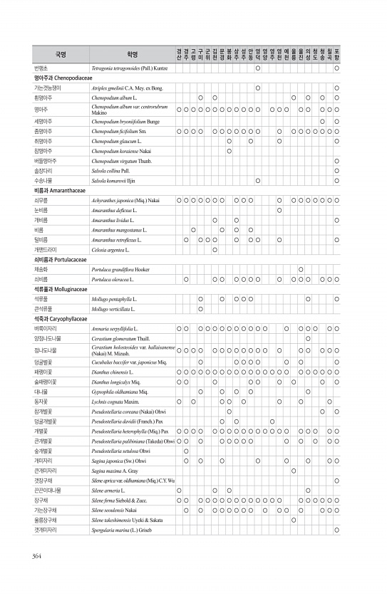 364 번행초 Tetragonia tetragonoides Pall. Kuntze ○ ○ 명아주과 Chenopodiaceae 가는갯능쟁이 Atriplex gmelinii C.A. Mey. ex Bong. ○ ○ 흰명아주 Chenopodium album L. ○ ○ ○ ○ ○ ○ 명아주 Chenopodium album var. centrorubrum Makino ○ ○ ○ ○ ○ ○ ○ ○ ○ ○ ○ ○ ○ ○ ○ ○ ○ ○ ○ ○ 세명아주 Chenopodium bryoniifolium Bunge ○ ○ 좀명아주 Chenopodium fcifolium Sm. ○ ○ ○ ○ ○ ○ ○ ○ ○ ○ ○ ○ ○ ○ ○ ○ ○ ○ ○ 취명아주 Chenopodium glaucum L. ○ ○ ○ ○ 참명아주 Chenop...