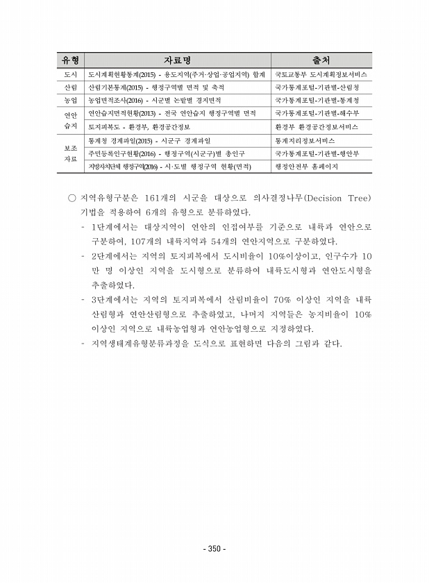 유형 자료명 출처 도시 도시계획현황통계 2015 용도지역 주거·상업·공업지역 합계 국토교통부 도시계획정보서비스 산림 산림기본통계 2015 행정구역별 면적 및 축적 국가통계포털-기관별-산림청 농업 농업면적조사 2016 시군별 논밭별 경지면적 국가통계포털-기관별-통계청 연안 습지 연안습지면적현황 2013 전국 연안습지 행정구역별 면적 국가통계포털-기관별-해수부 토지피복도 환경부, 환경공간정보 환경부 환경공간정보서비스 보조 자료 통계청 경계파일 2015 시군구 경계파일 통계지리정보서비스 주민등록인구현황 2016 행정구역 시군구 별 총인구 국가통계포털-기관별-행안부 지방자치단체 행정구역 2016 시·도별 행정구역 현황 면적 행정안전부 홈페이지 350