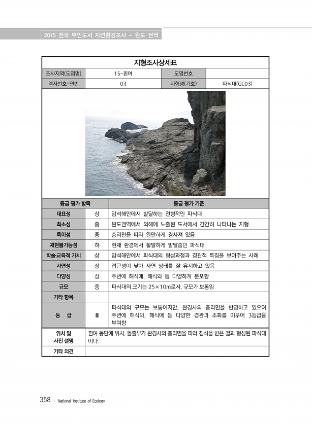 2015 전국 무인도서 자연환경조사 완도 권역 358 ? National Institute of Ecology 지형조사상세표 조사지역 도엽명 15-흰여 도엽번호 격자번호-연번 03 지형명 기호 파식대 GC03 등급 평가 항목 등급 평가 기준 대표성 상 암석해안에서 발달하는 전형적인 파식대 희소성 중 완도권역에서 외해에 노출된 도서에서 간간히 나타나는 지형 특이성 중 층리면을 따라 완만하게 경사져 있음 재현불가능성 하 현재 환경에서 활발하게 발달중인 파식대 학술?교육적 가치 상 암석해안에서 파식대의 형성과정과 경관적 특징을 보여주는 사례 자연성 상 접근성이 낮아 자연 상태를 잘 유지하고 있음 다양성 상 주변에 해식애, 해식와 등 다양하게 분포함 규모 중 파식대의 크기는 25×10m로서, 규모가 보통임 기타 항...