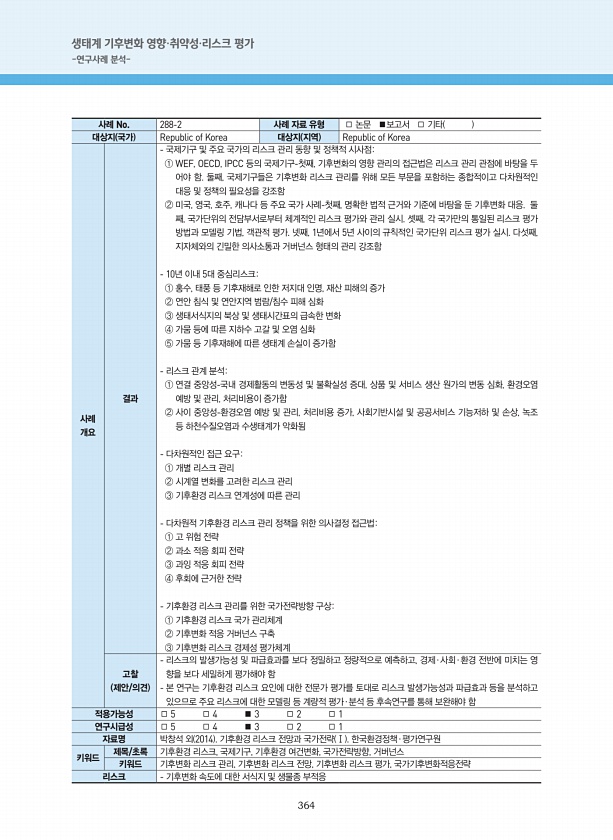 364 생태계 기후변화 영향·취약성·리스크 평가 -연구사례 분석- 사례 No. 288-2 사례 자료 유형 □ 논문 ■보고서 □ 기타 대상지 국가 Republic of Korea 대상지 지역 Republic of Korea 사례 개요 결과 국제기구 및 주요 국가의 리스크 관리 동향 및 정책적 시사점① WEF, OECD, IPCC 등의 국제기구-첫째, 기후변화의 영향 관리의 접근법은 리스크 관리 관점에 바탕을 두 어야 함. 둘째, 국제기구들은 기후변화 리스크 관리를 위해 모든 부문을 포함하는 종합적이고 다차원적인 대응 및 정책의 필요성을 강조함 ② 미국, 영국, 호주, 캐나다 등 주요 국가 사례-첫째, 명확한 법적 근거와 기준에 바탕을 둔 기후변화 대응. 둘 째, 국가단위의 전담부서로부터 체계적인 리스크 평가와...