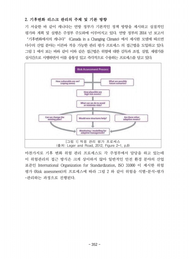 2. 기후변화 리스크 관리의 주체 및 기본 방향 기 서술한 바 같이 캐나다는 연방 정부가 기본적인 정책 방향을 제시하고 실질적인 평가와 계획 및 실행은 주정부 주도하에 이루어지고 있다. 연방 정부의 2014 년 보고서 ‘기후변화에서의 캐나다’ Canada in a Changing Climate 에서 제시한 모델에 따르면 다수의 산업 분야는 이른바 적응 가능한 관리 평가 프로세스 의 접근법을 도입하고 있다. 그림 1 에서 보는 바와 같이 이와 같은 접근법은 위험에 대한 감독과 조정, 실험, 재평가를 실시간으로 시행하면서 이를 융통성 있고 즉각적으로 수용하는 프로세스를 담고 있다. 마찬가지로 기후 변화 위험 관리 프로세스도 각 주정부에서 담당을 하고 있는데 이 위험관리의 접근 방식은 크게 상이하지 않아 일반적인...